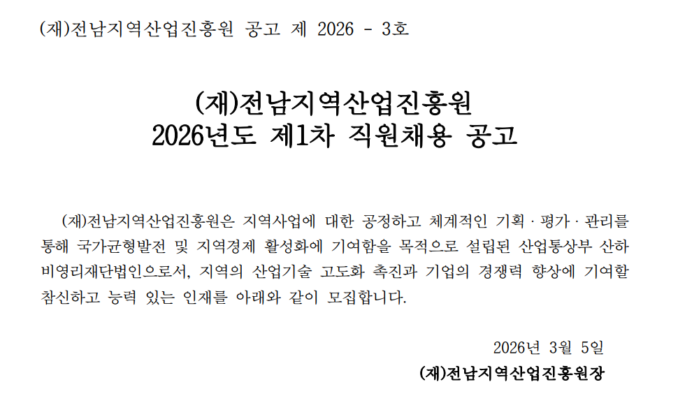 (재)전남지역산업진흥원 2026년도 제1차 직원채용 공고