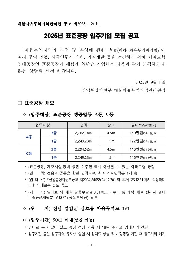 대불자유무역지역관리원 표준공장 입주기업 모집